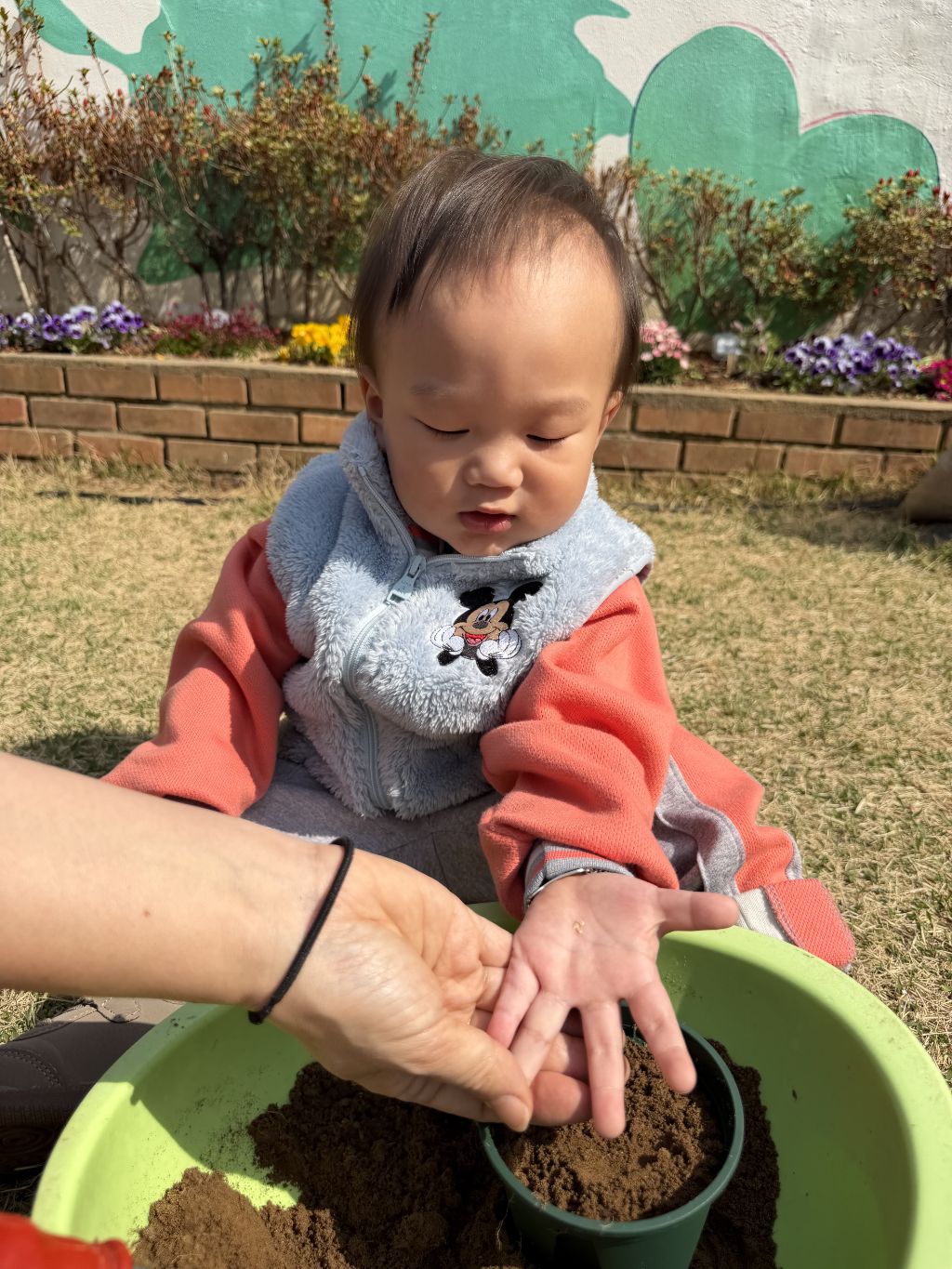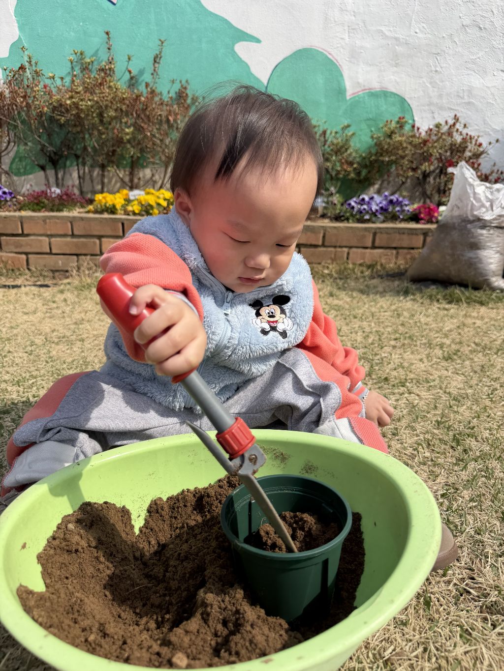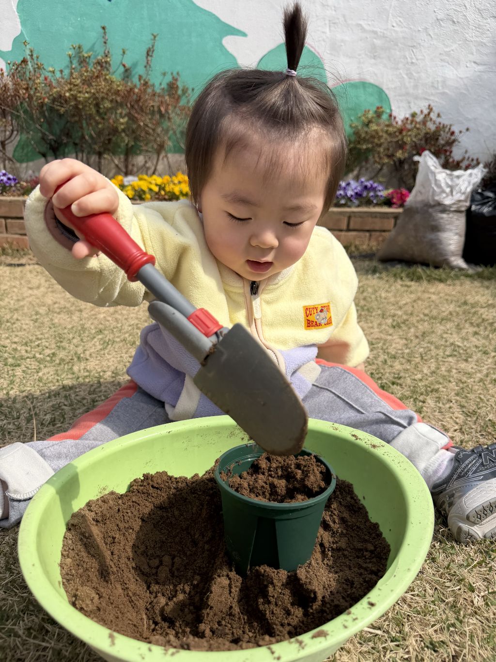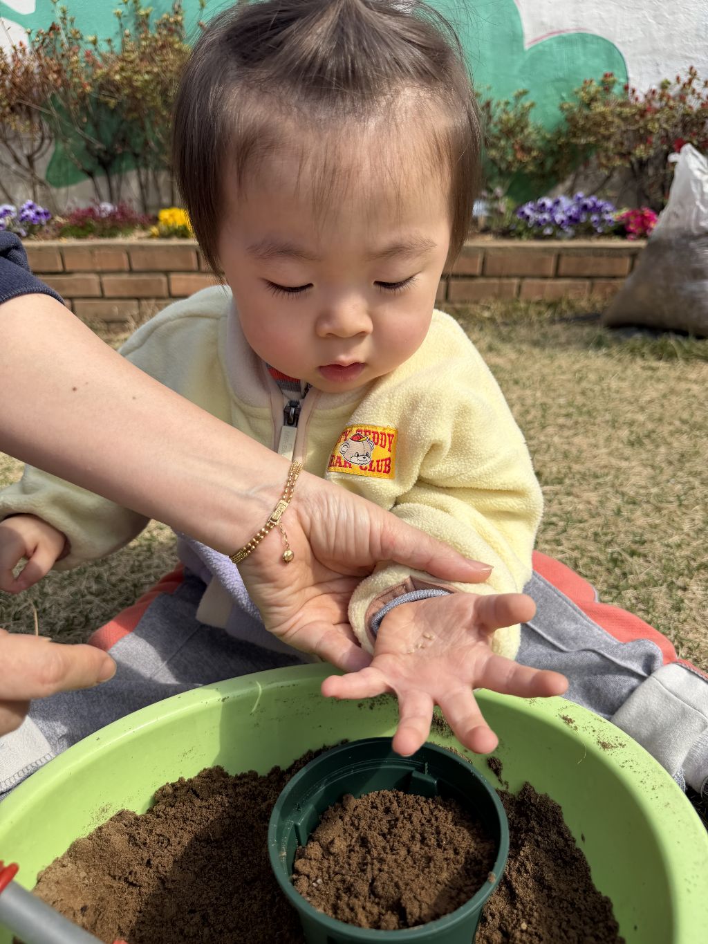 호기심을 보이고, 흙을 살짝 덮어주며