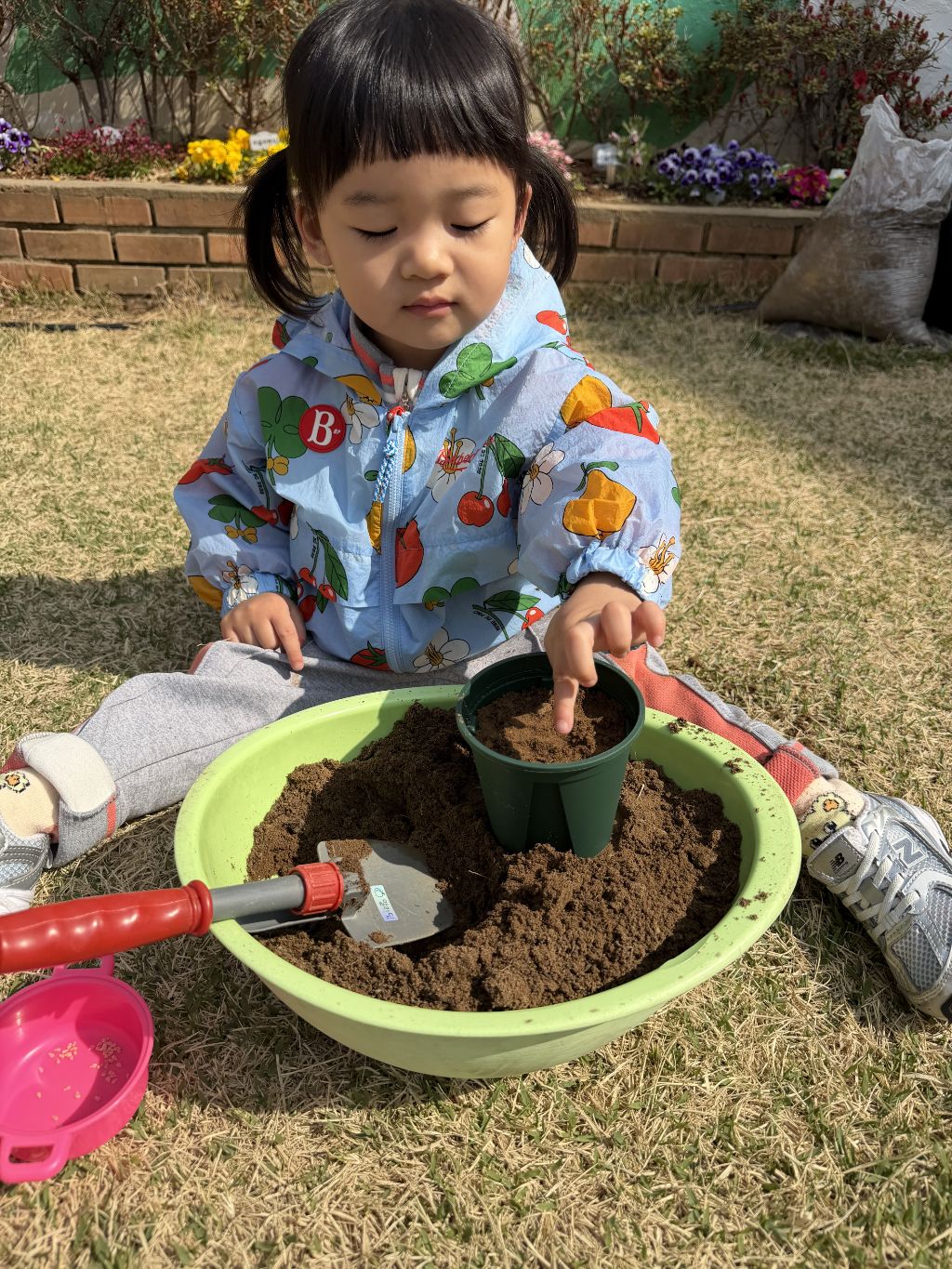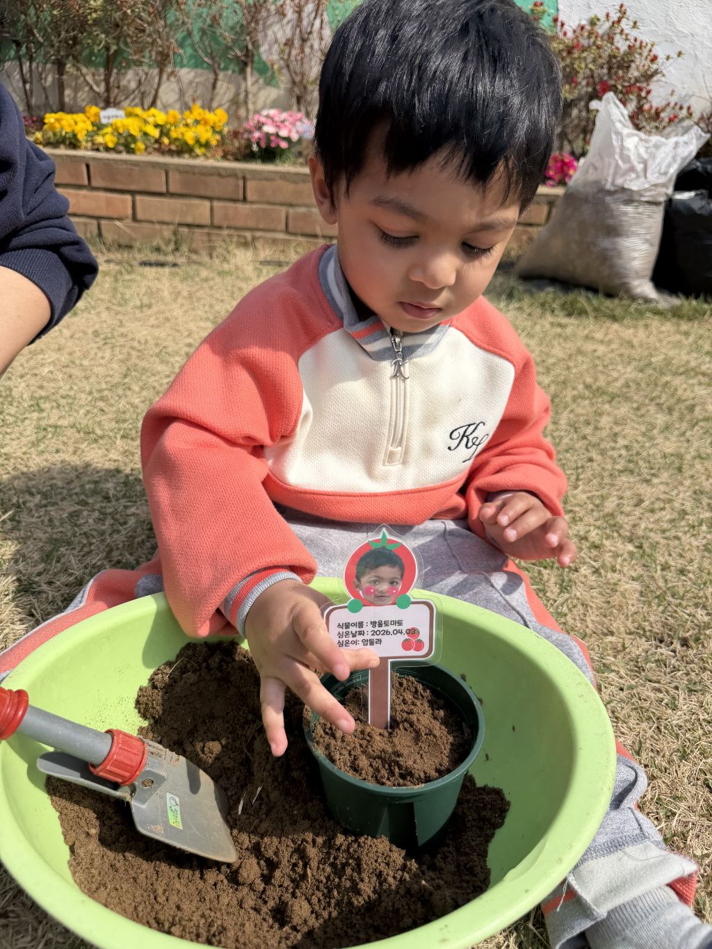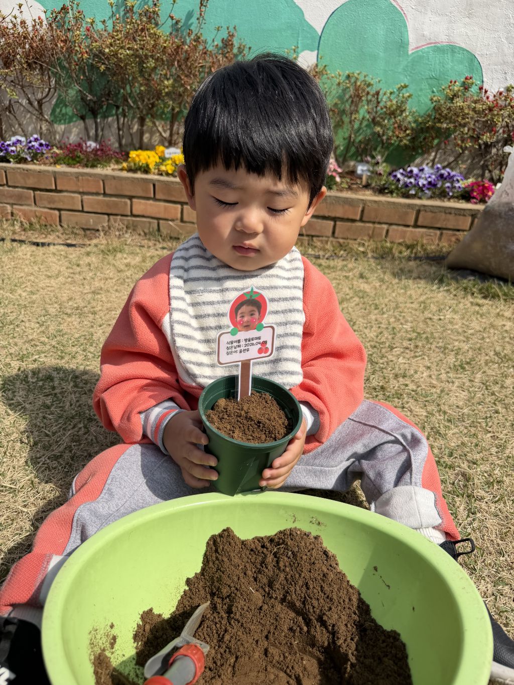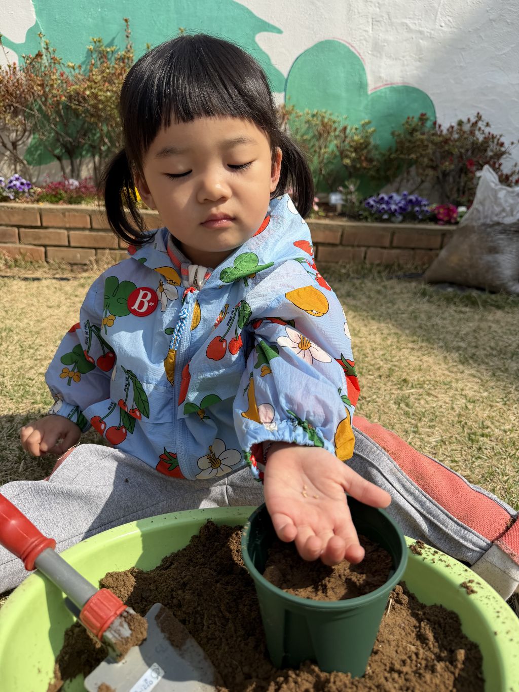 씨앗을 심은 뒤에는 흙을 살짝 덮어주며 “잘 자라라” 하고 표현해보는 모습도 보였습니다.