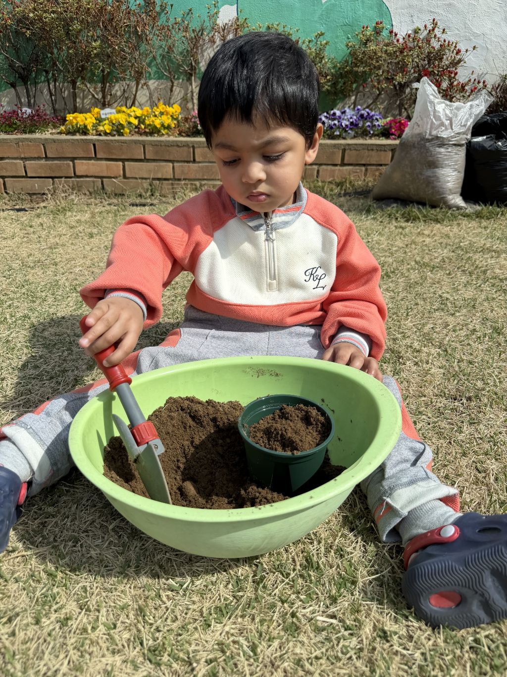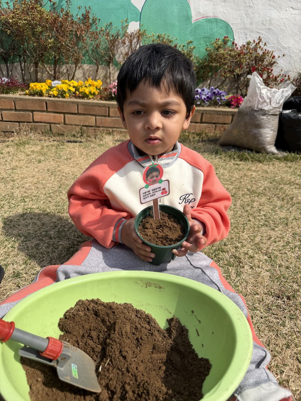 놀이터로 이동한 뒤에는 화분에 직접 흙을 담아보는 경험을 해보았습니다.