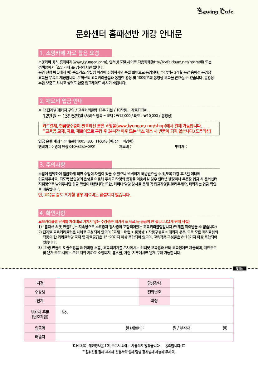 2017년 1월 새롭게 오리엔테이션 재편집 작성자소잉카페_ΚΗ|작성시간17.01.12|조회수170 목록 댓글 0 글자크기 작게가 글자크기 크게가 소잉카페 홈페이지; http://www.kyungae.com 소잉카페 쇼핑몰; http://sewingcafe.com 다음검색 현재 게시글 추가 기능 열기 북마크 공유하기 신고 센터로 신고 댓글 댓글 0 댓글쓰기 댓글 리스트