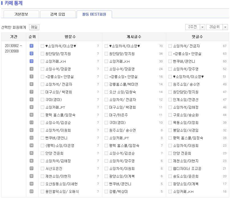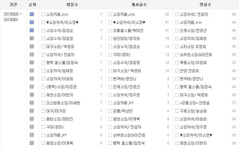 [활동 BEST회원]카페활동 BEST회원 (20순위까지) 9월1일~9월8일 작성자소잉카페_ΡТ|작성시간13.09.05|조회수46 목록 댓글 1 글자크기 작게가 글자크기 크게가 다음검색 현재 게시글 추가 기능 열기 북마크 공유하기 신고 센터로 신고 댓글 댓글 1 댓글쓰기 답글쓰기 댓글 리스트 작성자소잉차석/이원희 | 작성시간 13.09.11 이벤트 당첨선정에 꼭 필요한 정보입니다..ㅎㅎ저는 권한이 없으니 지난주 집계와 다음주 집계도 부탁드릴께요~~ 댓글 전체보기