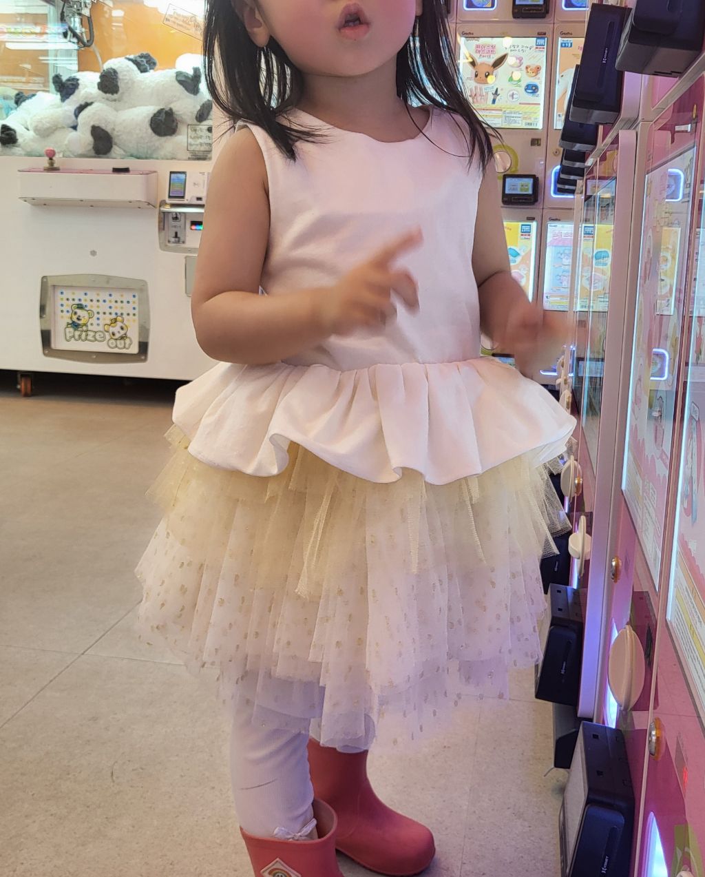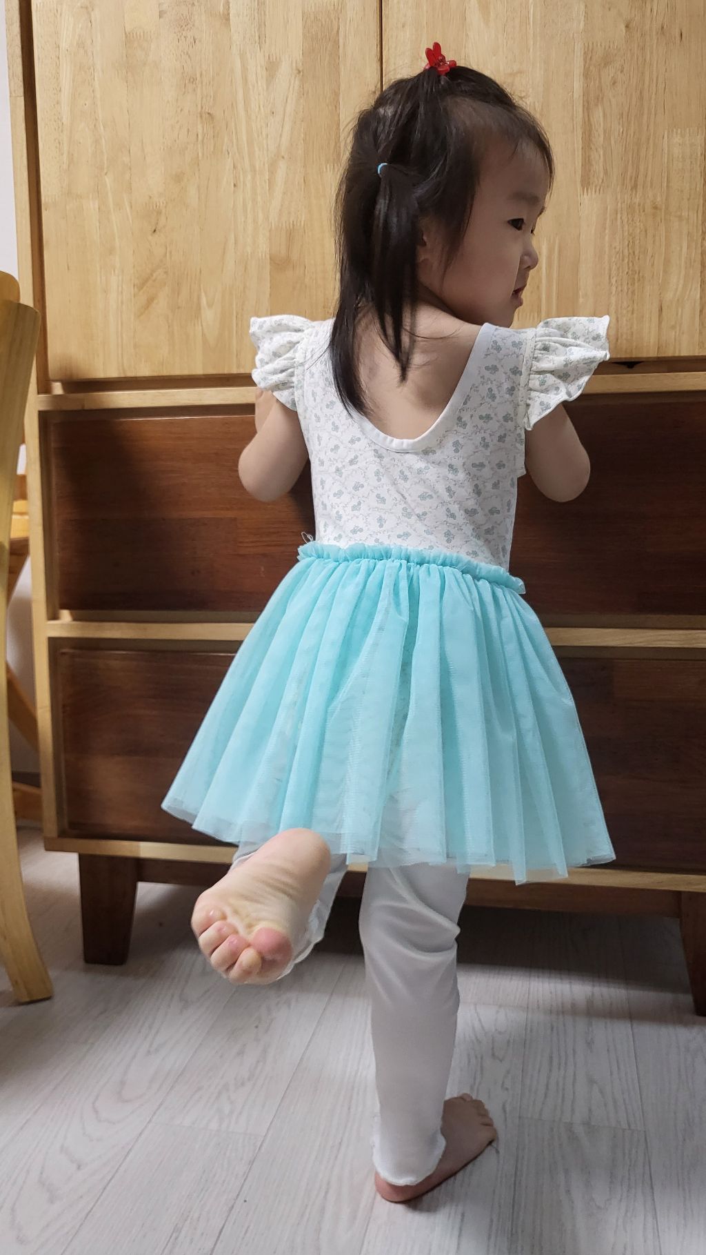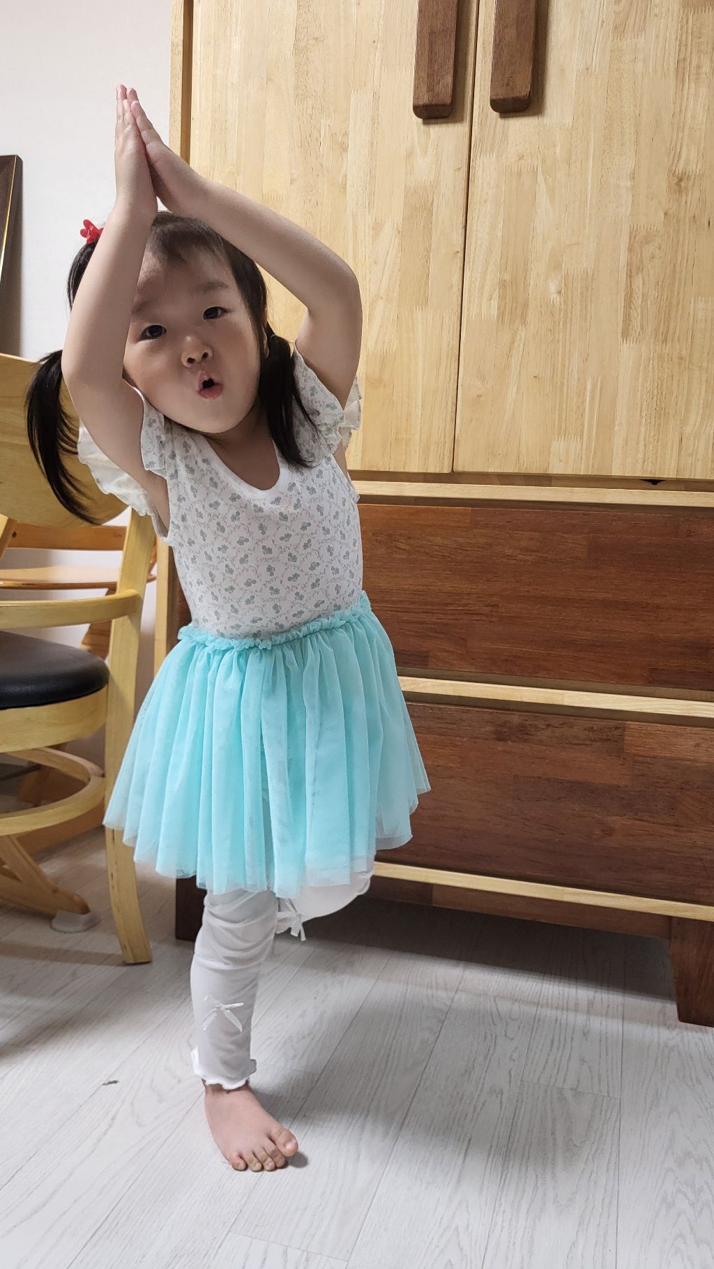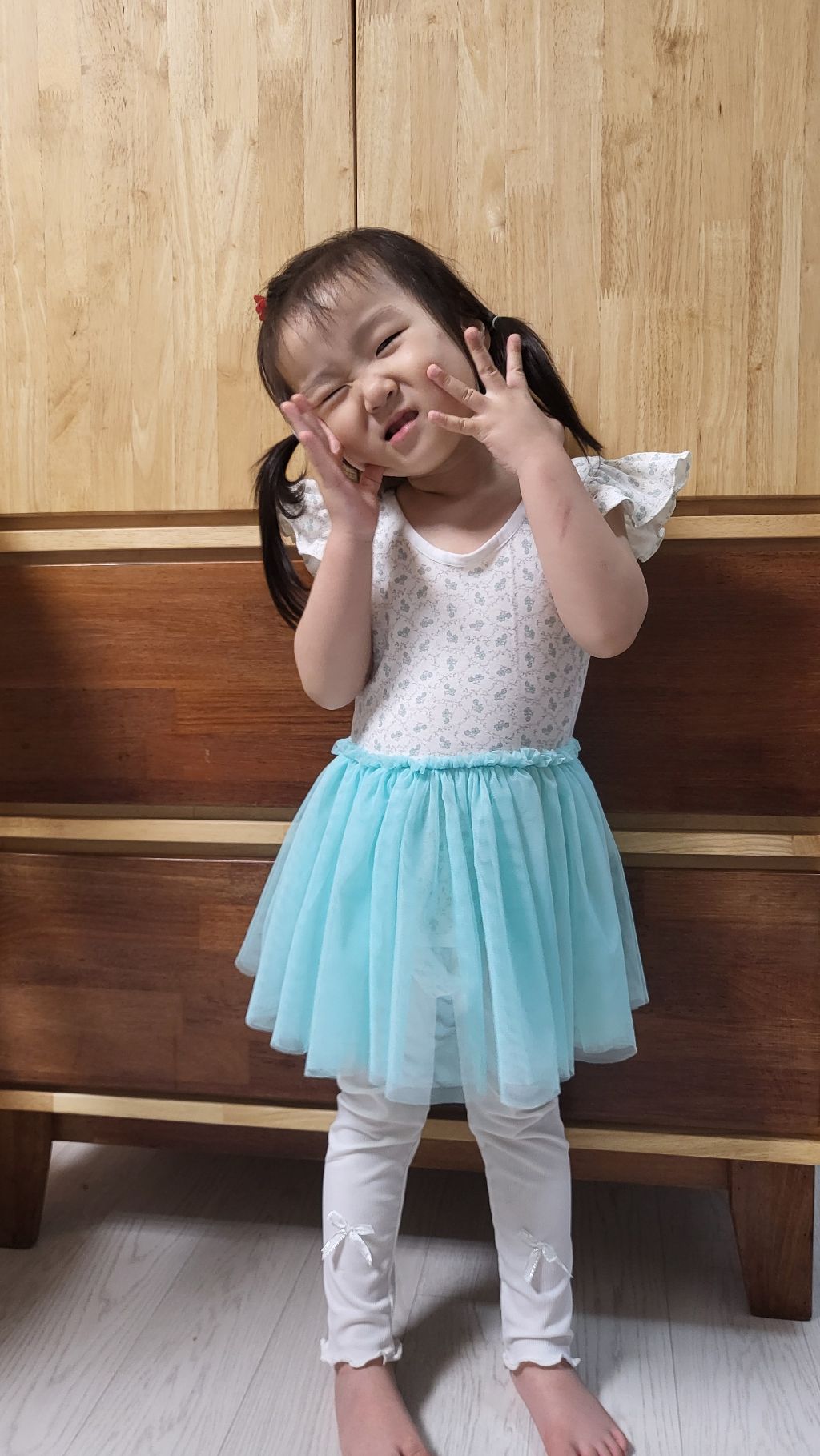100사이즈 곧 36개월 되는 아이에게 딱 맞아요! 생각했던거보다 더 예쁘네요~ 다른분들은 스커트를 따로 만드시기도 했는데, 저는 그냥 부착!