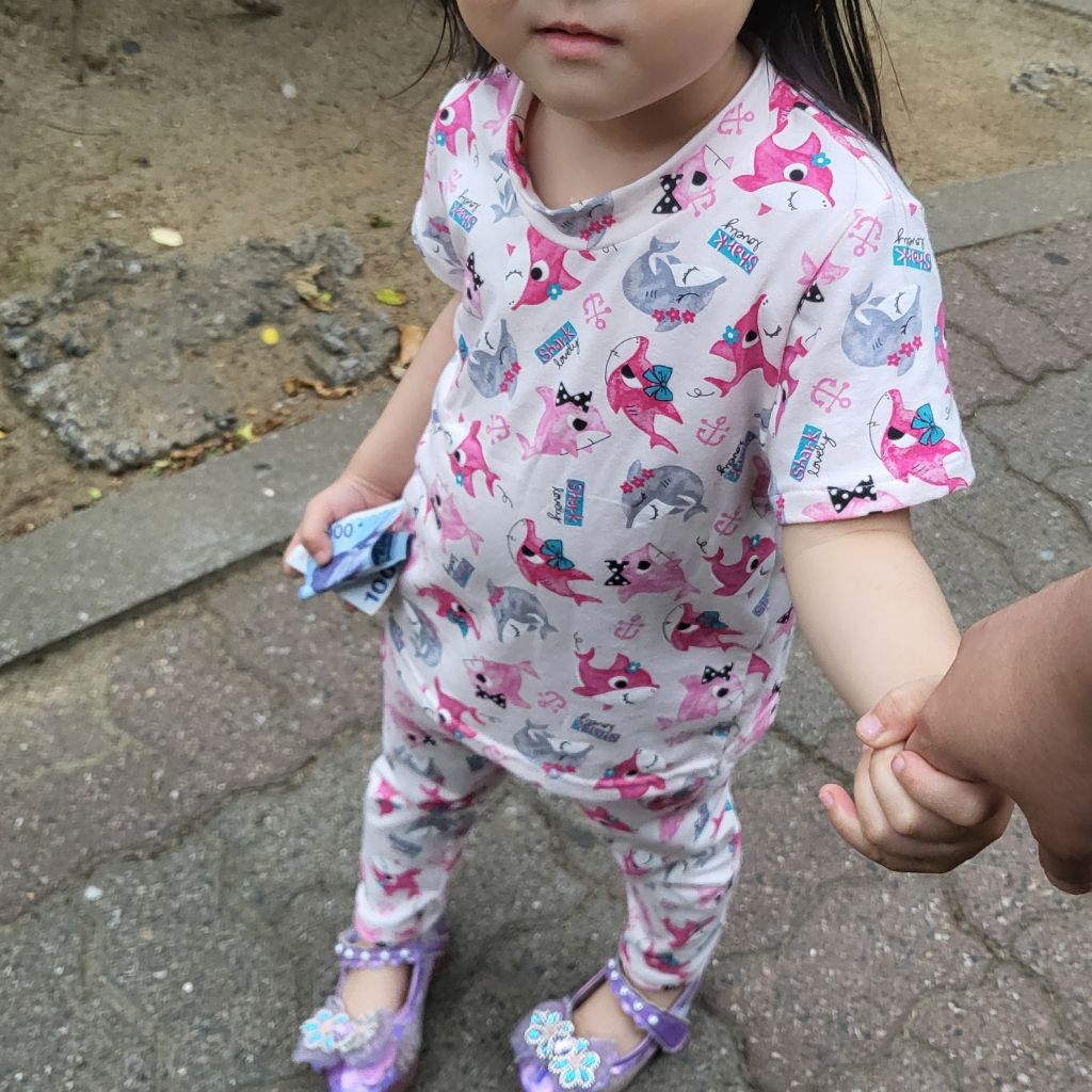 처음엔 거들떠 보지도 않더니 만든옷 입고 좋아하니 좋네요~ 지금까지 100사이즈로 만들었어요! 30개월이상 입힐만 한거 같아요!!(현 35개월) 아기상어 원단은 우리 수업하는 티셔츠랑 레깅스 패턴으로 만들었습니다!