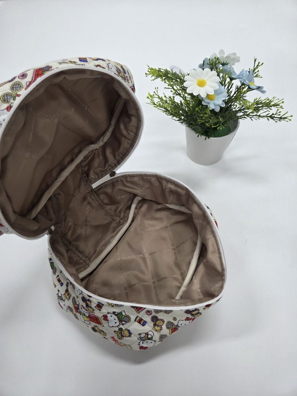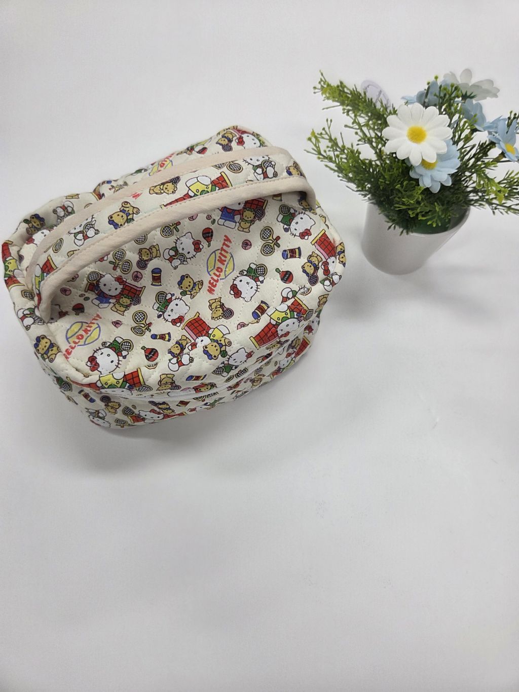 제가 제일 좋아하는 키티 원단을 사용했답니다. 긴 용기의 화장품을 통째로 가지고 다니지 않아서.. 위뚜껑쪽이 조금 짧게 만들어도 되지 않을까 생각해보았답니다. 기능사 끝나고 위아래 비율 조정 다시하고.. 좀 더 빳빳한 가방심지 붙여서 다시 만들어 볼까 해요.