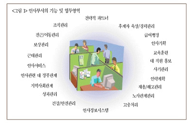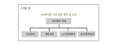 <그림 1>은 인사관리 과정에 있어 인사부서의 직무분야를 기능에 따라 세분화한 것이다. 이런 직무들은 각 조직의 환경과 조직의 크기 등에 따라 그 기능이 필요하지 않을 경우도 있고, 있더라도 사정에 따라 통합되거나 더 세분화돼 인사부(Human Resources Department) 조직에 편제된다. 물론 조직이 아주 작은 경우 이 기능들은 인사부서의 존재 없이 다른 관리부서에 의해 수행되기도 한다.