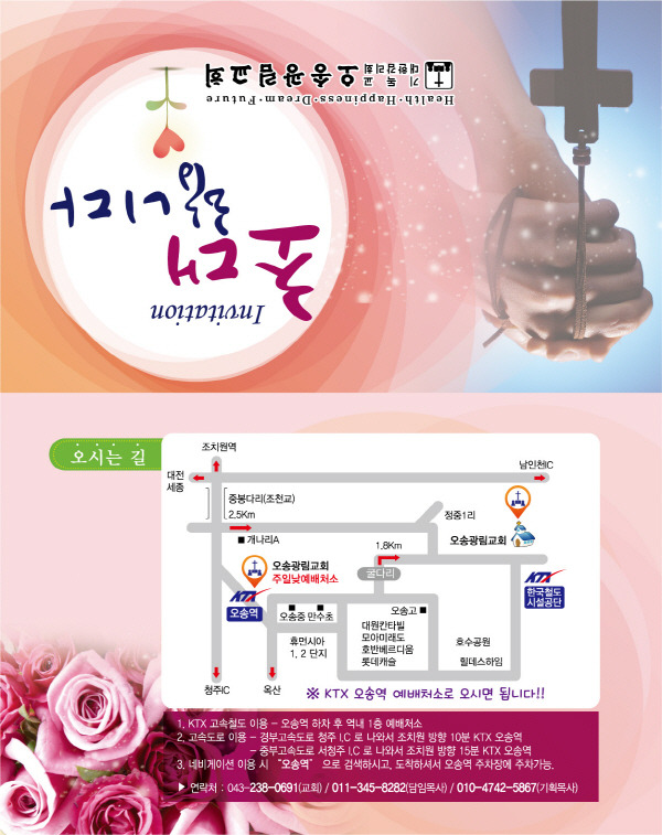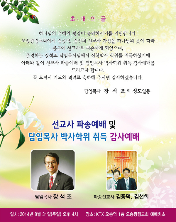 선교사 파송예배 및 박사학위 취득 감사예배 작성자장석조|작성시간14.08.06|조회수136 목록 댓글 0 글자크기 작게가 글자크기 크게가 교회 이름을 만인교회에서 오송광림교회로 변경을 하였습니다.더불어 본교회 3호 선교사 가정의 파송예배와 부족하나마 금번 박사학위를 축하하는 예배를 아래와 같이 드리게 되어 동기 여러분들께 알려드립니다. 다음검색 현재 게시글 추가 기능 열기 북마크 공유하기 신고 센터로 신고 댓글 댓글 0 댓글쓰기 답글쓰기 댓글 리스트