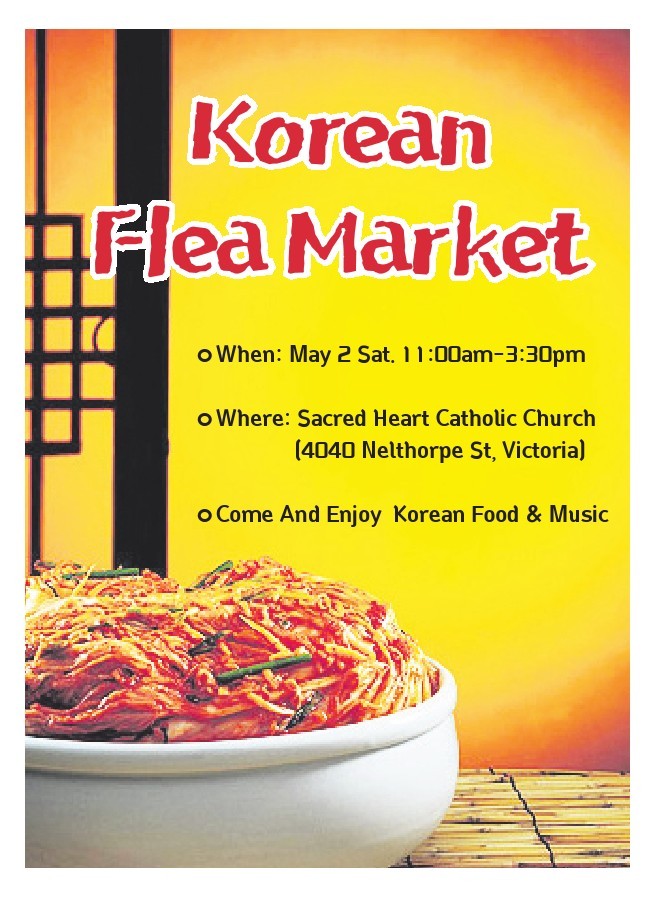 작성자권영제 요한 작성시간 15.04.10 혹 영어 광고에 Flea Market 보다는 Korean Food Festival 이 어떨까요? Flea Market 이라하니 그냥 Garage Sale 같이 Second Hand , 즉 입던 옷, 혹은 쓰던 가정용품 Sale 같은 냄새가 나서....