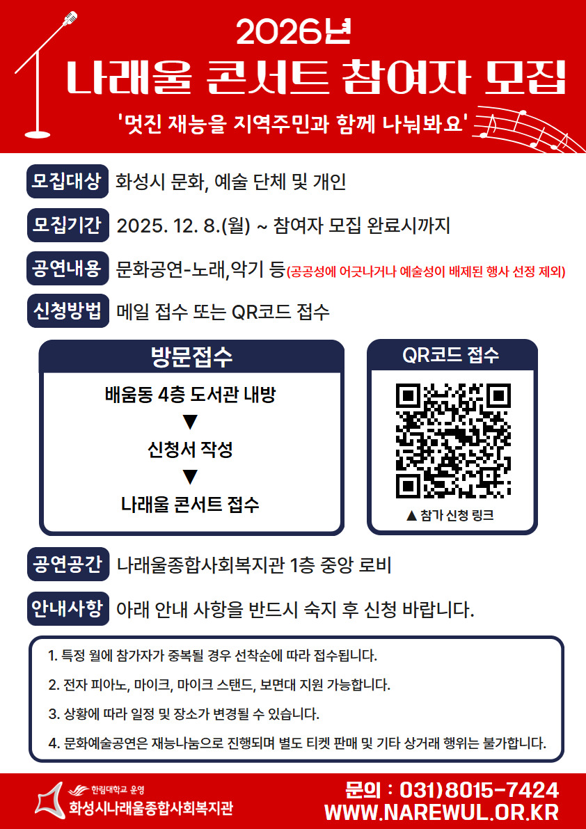 [화성시나래울종합사회복지관] 2026년 나래울콘서트 참여자 모집 작성자화성시생활문화센터|작성시간26.01.27|조회수112 목록 댓글 1 글자크기 작게가 글자크기 크게가 안녕하세요 화성시생활문화센터입니다. 화성시나래울종합사회복지관에서 재능기부형 공연 참여자를 모집합니다. 자세한 사항은 아래 포스터를 참고해주시기 바랍니다. 감사합니다. 다음검색 현재 게시글 추가 기능 열기 북마크 공유하기 신고 센터로 신고 댓글 댓글 1 댓글쓰기 답글쓰기 댓글 리스트 작성자나래울공연담당 | 작성시간 26.01.27 안녕하세요. 화성시나래울종합사회복지관 공연 담당자입니다. 많은 관심 부탁드립니다.*****공연 신청 링크 : https://forms.gle/fvP6oPXZ616ywd3E6 댓글 전체보기