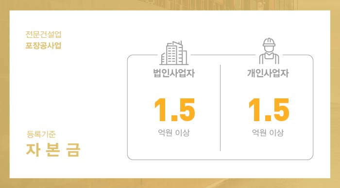 자본금 1억 5천만원 이상을 준비해야 포장공사업 면허 취득을 하실 수 있게 됩니다.