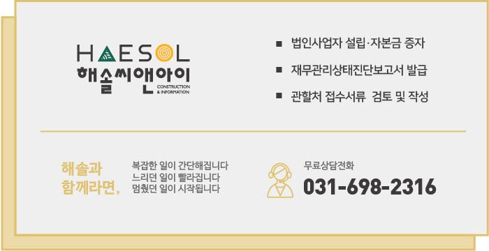 자본금 준비 후에는 재무제표를 분석하여 건설업 실질자본금 보유 유무를 판단하는 기업진단을 통해, 자본금 보유 적격판정을 받은 기업진단보고서를 준비 해 주셔야 하는데요, 기업진단은 전문 진단기관의 경영지도사, 세무사, 회계사를 통해 받아보실 수 있으며 해솔씨앤아이를 통해서도 발급 안내가 가능합니다.
