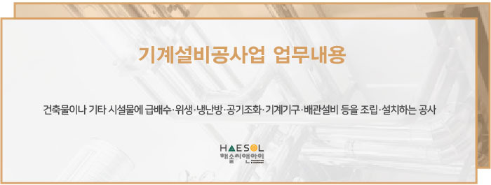 기계설비공사업은 건축물이나 기타 시설물에 급배수/위생/냉난방/공기조화/기계기구/배관설비 등을 조립/설치하는 공사를 하는 것으로 건당 공사예정금액이 1,500만원 이상되는 업무를 하고자 할 경우 반드시 면허 취득을 우선하도록 안내되는 전문건설업종 중 하나의 공사업입니다.