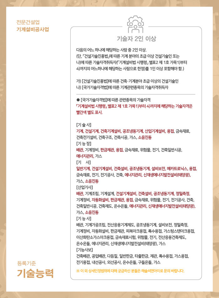 기술자는 최소 2인 이상 보유해야 하는데요, 해당 기술인력은 한국건설기술인협회에서 발급하는 건축/기계 분야의 초급 이상 경력수첩 소지자 또는 관련한 종목의 국가기술자격증을 취득한 기술자격취득자로써 구성이 되어야 합니다.