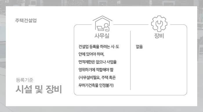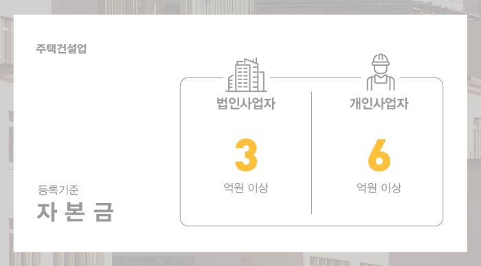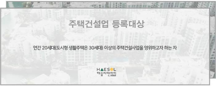 연간 20세대(도시형 생활주택은 30세대) 이상의 주택건설사업을 영위하고자 할 경우에는 관련 법에 의거하여 등록기준을 충족한 후 주택건설업 면허 취득을 반드시 해 주셔야 합니다.