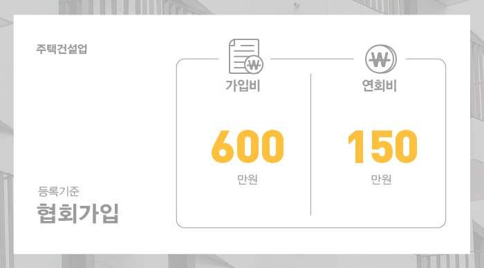 협회의 경우 면허 등록을 위해 반드시 준비해야 하는 등록기준 요건은 아니지만 원활한 사업 운영을 하기 위해 의례적으로 가입되는 부분으로 협회 가입비 600만원, 연회비 150만원의 비용이 납부되어야 합니다.