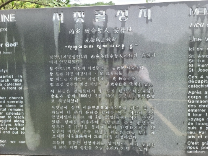 참수된지 두 달 뒤 황석두 성인의 시신은 가족들의 손으로 수습되어 삽티에 안장 되고...안토니오 다블뤼 주교 등 4위의 시신은 서짓골에 살던 신자들에 의해 9월1일(음.7월15일)이곳 서짓골 에 묻혔다.