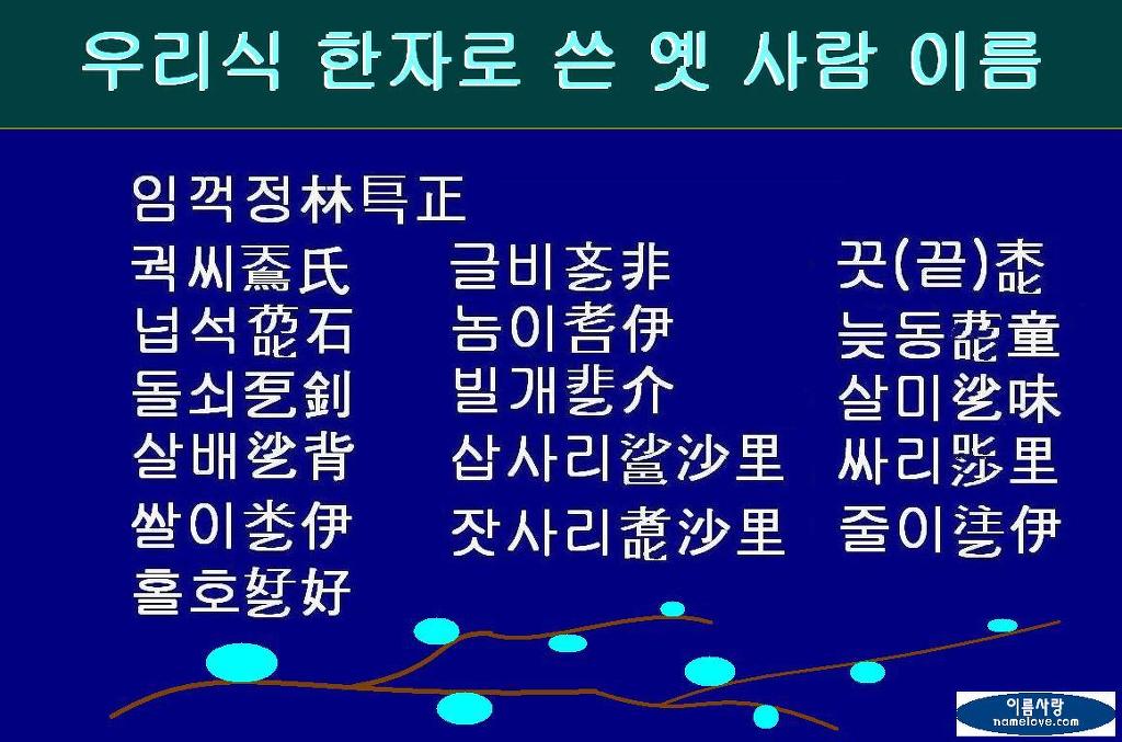 토박이 이름의 한자식 표기 - 우리말 토박이 이름을 한자로 억지로라도 적자니 우리식 한자가 필요해 - 요즘 사람더러 우리말 ‘돌쇠놈’을 한자로 적어 놓으라고 하면 막막해할 수가 있을 것이다. ‘놈’자에 해당하는 한자를 별로 볼 수 없었기 때문이다. 그런데, 우리 조상들은 이를 ‘乭釗䎛’이라고 적고 ‘돌쇠놈’으로 읽었다. ‘돌’을 ‘돌(石)’의 뜻에 해당하는 ‘石’에 음을 나타내는 ‘乙’을 받쳐 ‘乭’로 적어 ‘돌’의 뜻과 음을 동시에 나타냈고, ‘노(老)’자에 한글 자모 ㅁ 모양의 口(입 구)를 받쳐 ‘놈’을 표기했다. 우리말(한글)과 한자의 조합인 셈이다.