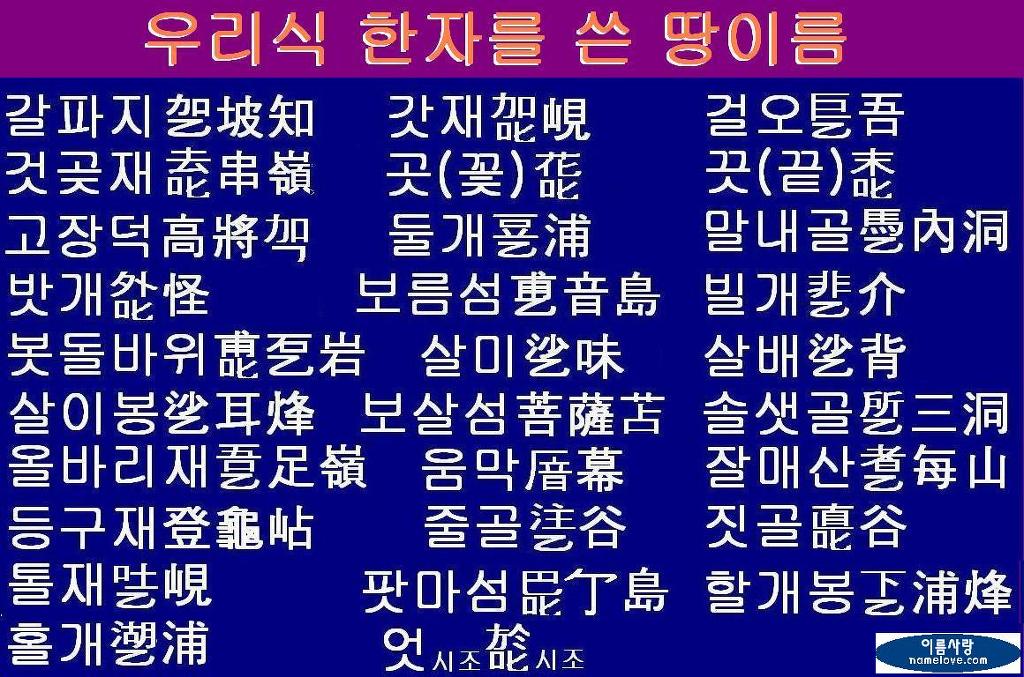 우리 조상들은 의적(義賊)으로 알려진 조선시대의 ‘임꺽정’을 어떻게 적었을까? 한자로 ‘林巨正’이라고 적기도 했지만, 이는 ‘임거정’으로 읽혀 원이름과 상당한 차이가 난다. 그러나, ‘꺽’자에 가까운 ‘걱’자를 만들어 적었다. ‘巨(거)’자에 한글 자모의 ㄱ자를 밑에 받쳐 ‘巪’자를 만들어 낸 것이다. ‘이쁜 애’란 뜻으로 ‘이뿐’이란 이름을 지었다면 이를 한자로 어떻게 적었을까? ‘入分(입분)’이나 ‘伊分(이분)’으로 적기도 했지만, ‘伊(이뿐)’으로 써서 완전한 발음이 되게 했다. ‘分(분)’자를 된소리로 만들기 위해 그 글자에 된소리를 의미하는 ‘叱’자를 위나 아래쪽에 붙였다. ‘叱’은 ‘꾸짖음’, ‘성을 냄’의 뜻이어서 ‘분’을 된소리로 발음하라는 뜻이었을 것이다. 참으로 기발한 생각이 아닐 수 없다. ‘곱단’이란 이름을 가졌다는 어느 할머니 이름이 호적에는 어떻게 올라라가 있나 했더니 ‘䯩丹’으로 나와 있었다. 원래의 한자에는 ‘곱’자가 없어 ‘高(고)’자에 ㅍ 발음에 근사한 ‘巴(파)’자를 받침으로 받쳐 ‘䯩(곱)’자를 만든 것이다. ‘보름섬’, ‘그믐섬’이란 이름의 섬이 있다. 이를 한자로 적어야 하는데, 적을 만한 ‘보름’의 ‘름’자나 ‘그믐’의 ‘믐’자가 없었다. ‘르’나 ‘므'자라도 있으면 거기에 ㅁ을 받쳐서라도 만들면 되었지만 그나마도 없었다. 그런데, 결국 연음(延音)을 이용해 이를 해결했다. ‘乶音島(볼음도)’와 ‘今音島(금음도)’로 적어 ‘보름섬’이나 ‘그믐섬’을 표기했다. ‘甫(보)’자에 우리글 ㄹ 모양의 乙을 받쳐 ‘볼’이라는 음을 우리식 한자로 만들어 적은 것도 참으로 재미있는 발상이다. ‘곰달내’라는 땅이름을 ‘고음월천(古音月川)’이나 ‘고음달내(古音達乃)’라고 표기한 것보다 더 앞선 생각이다. ‘바깥 개(浦)’란 뜻의 땅이름인 ‘밧개’는 ‘夞怪(밧괴)’로 적었다. '바깥'이란 뜻의 ‘外(외)’자에 ‘叱(질)’자를 받쳐 ‘밧’자를 만들어 낸 것. '밧'은 '바깥'의 옛말이다. 우리말 ‘움막’은 ‘굴’의 뜻인 ‘厂(굴바위 엄)’에 ‘움’에 근사한 음을 가진 ‘音(음)’자를 넣어 ‘움’으로 읽도록 하고, ‘幕(막)’자를 붙여 표기했다. 전남 고흥 해안에는 '봇돌바위'리는 바위섬이 나오는데, <대동여지도>에서는 이를 한자로 '喸乭島'로 표기했다. '喸乭'이란 한자 역시 우리식 한자다. '질(叱)'자는 이처럼 받침의 구실도 했다. 한자로의 표음이 불가능한 ‘갓’, ‘것’, ‘곱’, ‘넙’, ‘놀’, ‘놈’, ‘늣(늦)’, ‘댐’, ‘덜’, ‘덩’, ‘둘’, ‘둥’, ‘며’, ‘묠’, ‘볼’, ‘섬’, ‘얍’, ‘잘’, ‘줄’, ‘할’ 등의 글자도 한자와 우리 한글의 자모를 짜맞추어 완벽하게 만들어 냈다. 일부 한자의 불가능한 표음 기능을 받쳐 주기까지 하면서 어느 음이나 표현을 가능하게 한 한글은 고금을 통해 우리말을 표기하는 데 없어서는 안 될 훌륭한 글자였다. |