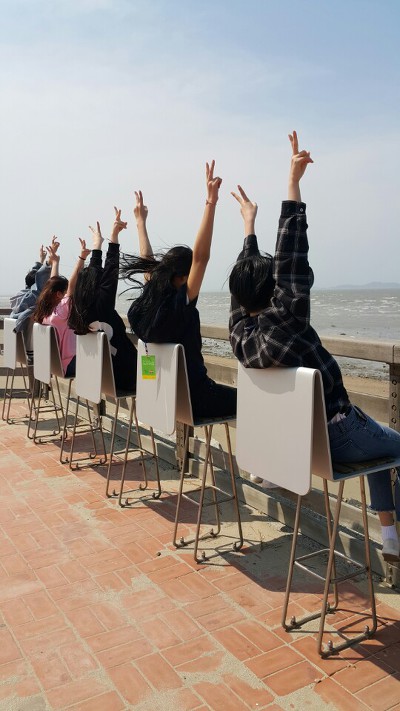 제부도 아트파크에 바다를 바라볼 수 있는 의자가 있어요~ 거기서 단체 사진 찰칵!!