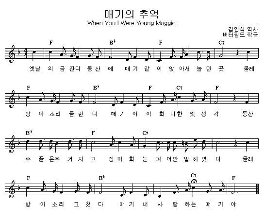 When You And I Were Young Maggie(메기의 추억) 작곡 / James Austin Butterfield (1837-1891) "메기의 추억(When You And I Were Young Maggie)"은 미국의 I wandered today to the hill, Maggie To watch the scene below The creek and the creaking old mill, Maggie As we used to long long ago! The green grove is gone from the hill, Maggie Where first the daisies sprung The creaking old mill is still, Maggie Since you and I were young! Oh they say that I'm feeble with age, Maggie My steps are mush slower than then My face is a well written page, Maggie And time all along was the pen. They say we have outlived our time, Maggie As dated as songs that we've sung But to me you're as fair as you were, Maggie When you and I were young. 사랑하는 그대여 동산아래 모습들을 보고싶은 마음에 언덕에 올랐었다오 그 옛날 우리가 같이 앉아 놀곤했던 시냇가와 낡고 오래된 물방앗간은 지금도 여전히 그곳에 있었다오 언덕 주위의 푸른 숲은 사라지고 없었다오, 사랑하는 그대여 귀여운 데이지꽃이 처음으로 피어났던 바로 그 숲 말이오 그대와 내가 어릴적부터 있어왔던 삐그덕거리던 낡은 물방앗간은 지금도 여전히 그곳에 있었다오 사람들은 말하기를 난 너무 늙었다고 그런다오, 그대여 지금 내 걸음걸이는 예전에 비해 너무나 느려졌다오 내 얼굴은 내가 살아온 인생을 말해주는 듯하다오 오랜 세월이 나를 그렇게 만들었다오 사람들은 우리보고 너무 오래 살았다고들 말을 하고 우리가 불러온 노래만큼이나 시대에 뒤떨어졌다고들 한다오 하지만 내게 그대는 여전히 아름답기만 하다오 그대와 내가 어렸을 때처럼 말이오 - 간주 - 사람들은 우리보고 너무 오래 살았다고들 말을 하고 우리가 불러온 노래만큼이나 시대에 뒤떨어졌다고들 한다오 하지만 내게 그대는 여전히 아름답기만 하다오 그대와 내가 어렸을때 처럼 말이오 그대와 내가 어렸을때 처럼 말이오 |