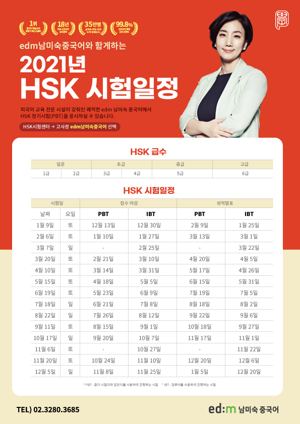 2021년 HSK 시험 일정(PBT, IBT) 안내드립니다.
