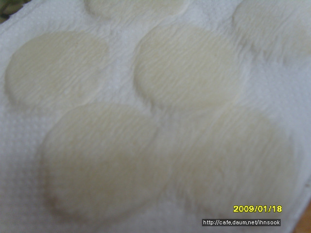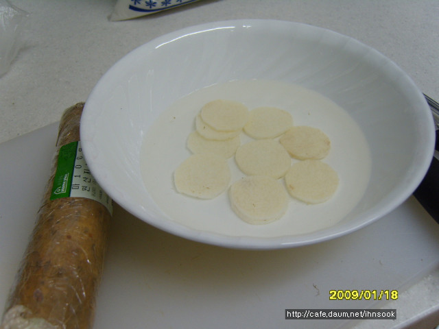 마는 지름 5cm 정도 굵기로 선택하여 껍질을 벗긴후 0,5cm두께로 썬다.