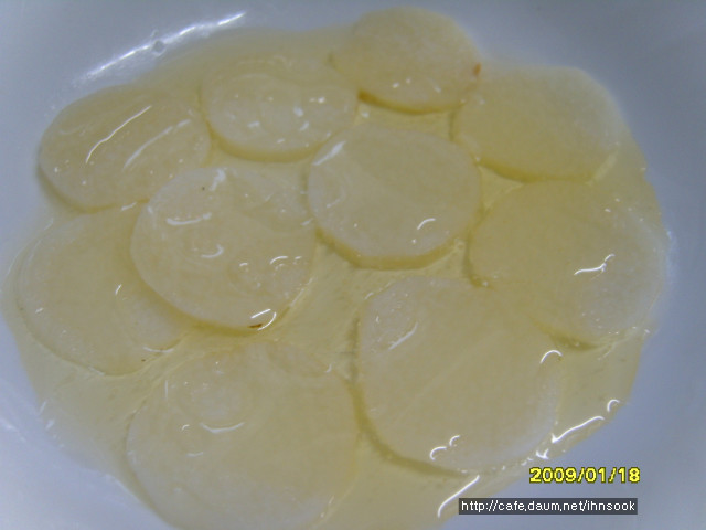 다른 재료를 준비하는동안 색의 변질을 막기위해 식촛물에 담가두었다.