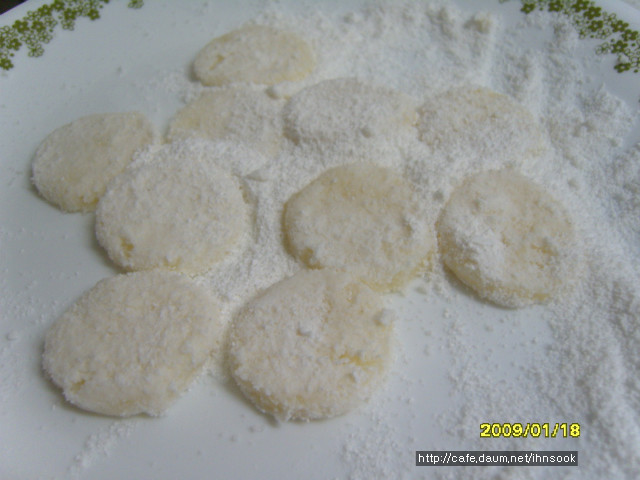 꿀에 재운 마를 건져서 찹쌀가루 1/3컵에 소금 조금넣고 체에내려준것으로 옷을 입혀서.....