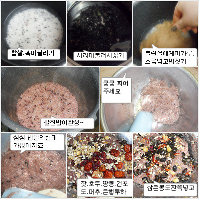 1.찹쌀과 검정콩을 물에 불려서 평소 밥짓듯이 전기밥솥에 쏘옥~소금간하구여.계피가루있어서 좀 넣었어요(물은평소보다 좀 적게하는게좋겠어요..치대다보니 너무 질어지더라구요~)