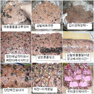 3.불린콩을 한시간가량 삶아서 식혀놓고..집에있는 온갖 견과류랑 냉동실에오래잠들었던 은행과 대추도넣고..콩도푸짐히 넣고 잘섞어서 삼바리에 찌면되요(찜솥도없는 열악한 환경 ㅋㅋ)...참..그리고...호떡믹스 마트에 파는거있자나요~거기들어있는 속재료~고놈이있길래 넣었떠니 달콤한맛이 ㅋㅋ