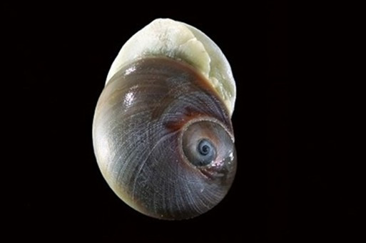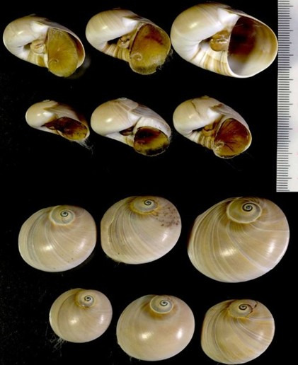 ► 형 태 : 크기는 패각의 각고 30mm, 각경 34mm 정도이다. 나층은 6층이며, 나탑이 낮아 납작하고 외순과 내순 사이의 활층 발달이 약하다. 제반은 크게 발달하지 않은 편이며, 제공 쪽으로 말려 있다. 제반은 농갈색이며 중간에 홈이 있어 둘로 나누어져 있다. 체층 둘레의 가장자리를 경계로 각저는 흰색이며, 상부는 회갈색이다.