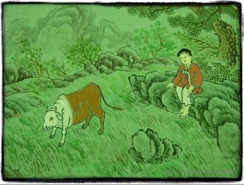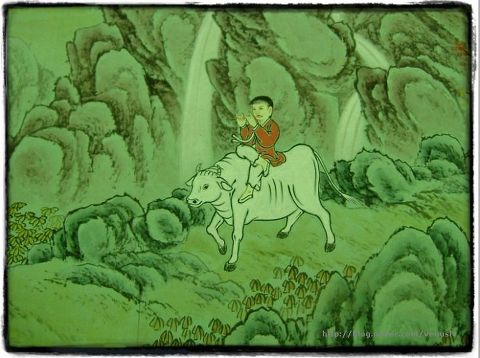 흰소에 올라탄 동자승이 피리를 불며 집으로 돌아오고 있다. 더 이상