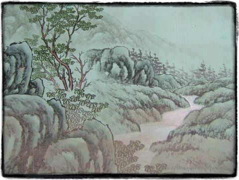 강은 잔잔히 흐르고 꽃은 붉게 피어 있는 산수풍경만이 그려져 있다.