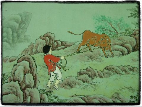 동자승이 소에 코뚜레를 뚫어 길들이며 끌고 가는 모습이다. 얻은 본성