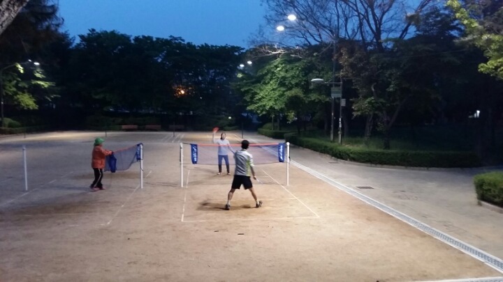 ▲공원에서 야간에 휘타구를 하고 있는 동호인들 / 휘타구문의 핸드폰☎3927 6333