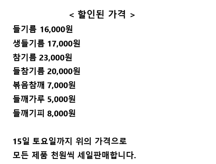 (15일까지) 봄맞이 국산 들기름 참기름 할인판매 작성자땅올콩|작성시간25.03.13|조회수45 목록 댓글 0 글자크기 작게가 글자크기 크게가 다음검색 현재 게시글 추가 기능 열기 북마크 공유하기 신고 센터로 신고 댓글 댓글 0 댓글쓰기 답글쓰기 댓글 리스트
