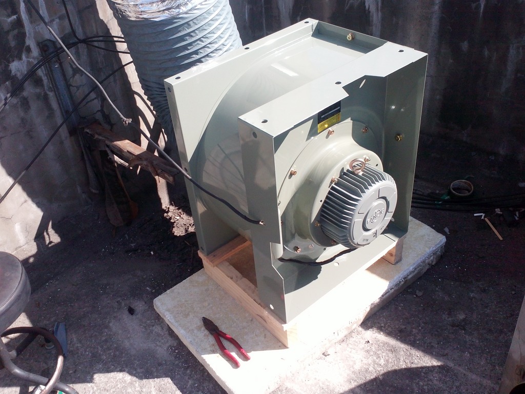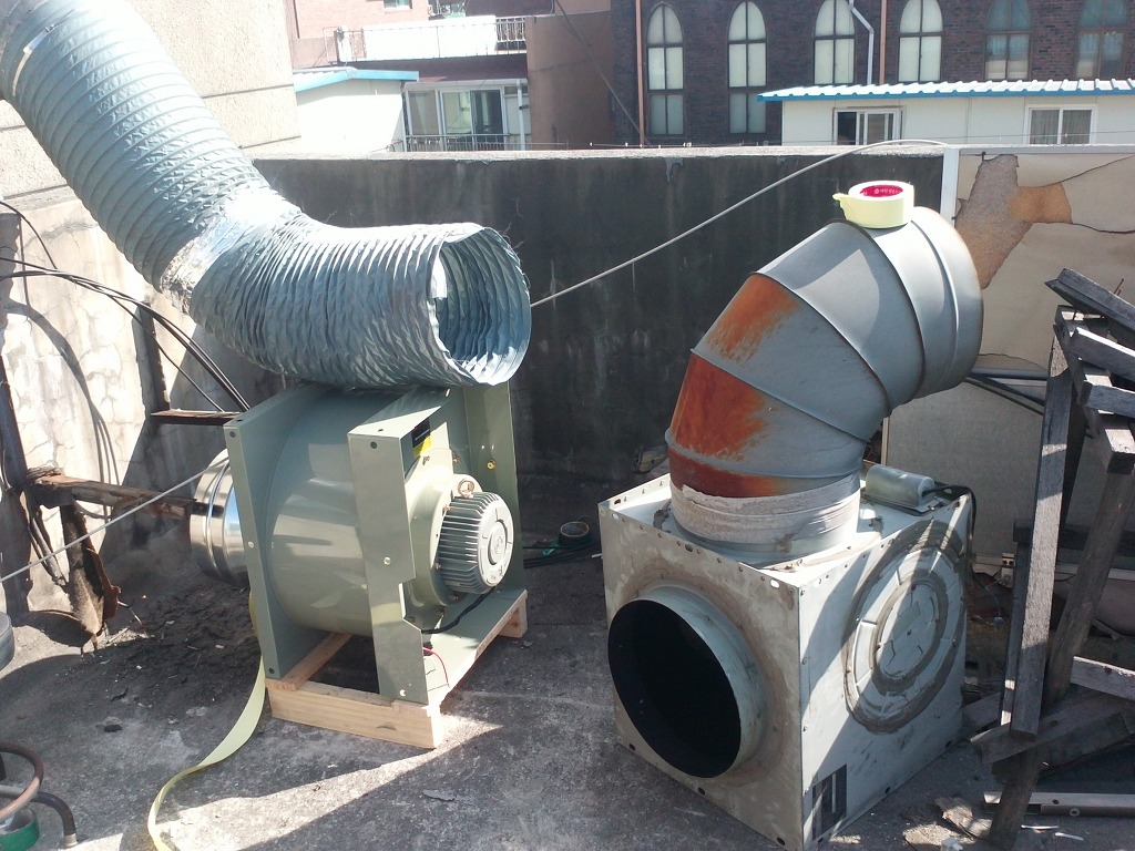 1층에서 4층 옥상까지 주방후드의 열기와 기름,수증기를 배출해야하기에 2마력의 시로코펜으로 교체하였습니다.