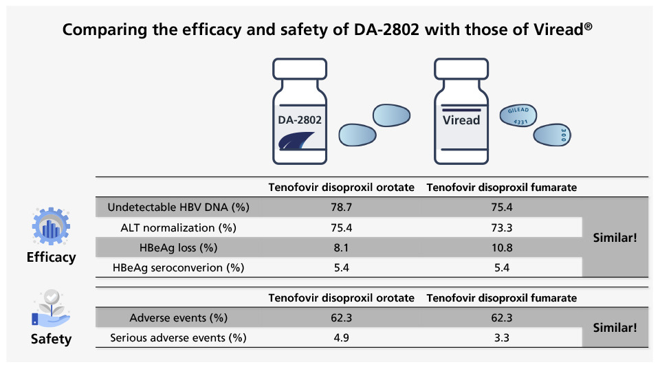 효능: 두 약물은 유사하며, 일부 지표는 DA-2802가, 일부는 Viread가 더 우수.