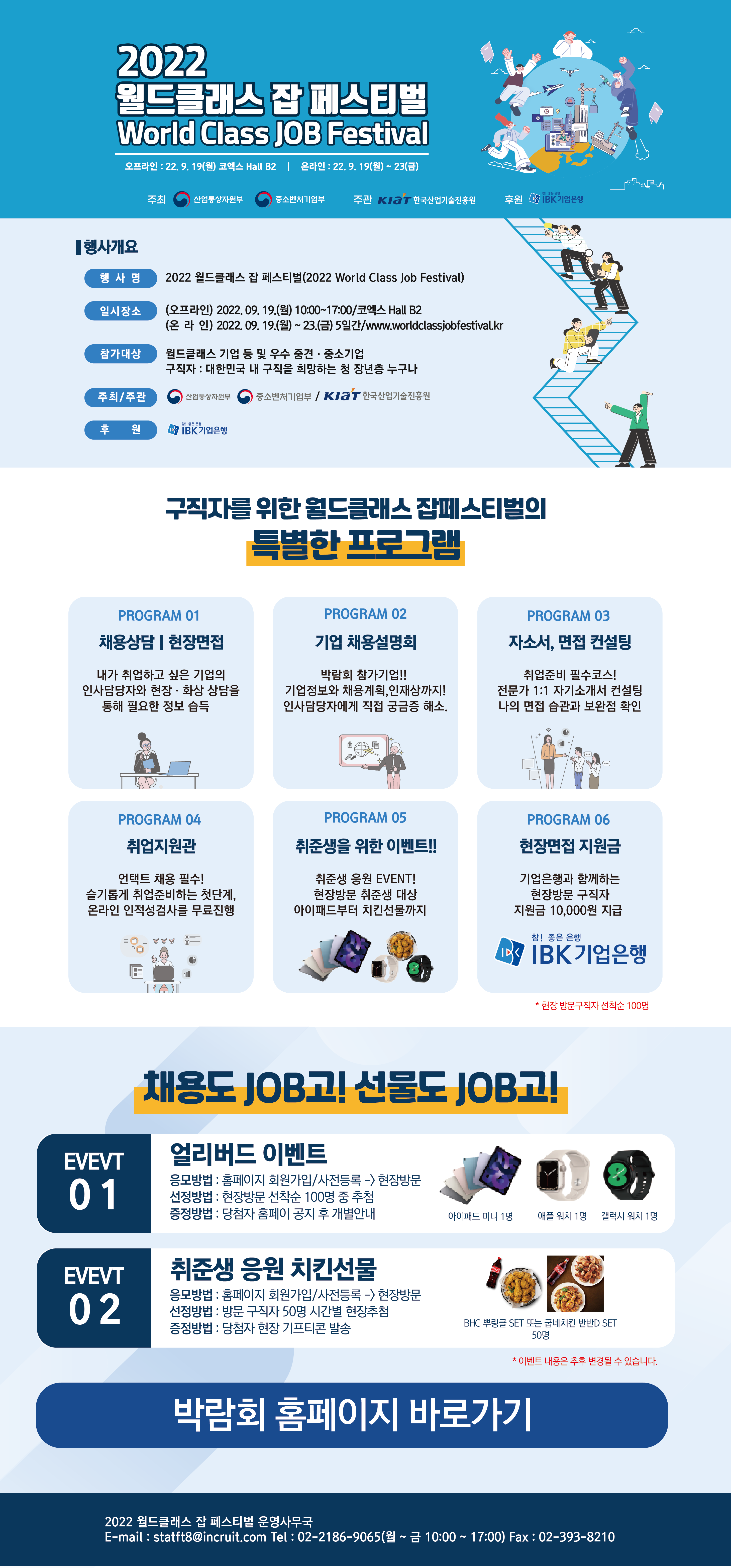 | 일시장소 | (오프라인) 2022. 09. 19.(월) 10:00~17:00/코엑스 Hall B2 (온라인) 2022. 09. 19.(월) ~ 23.(금) 5일간/www.worldclassjobfestival.kr | |