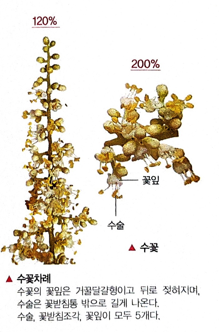 백색 또는 황백색으로 가지 끝에 촘촘히