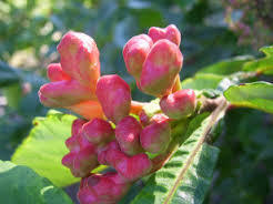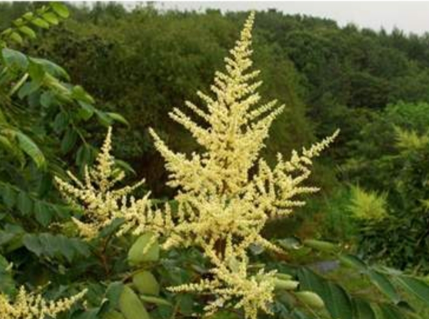 원뿔모양의 꽃차례에 꽃대는 곧추 세우고 황백색의 꽃이 피우고 있는 나무가 있다.