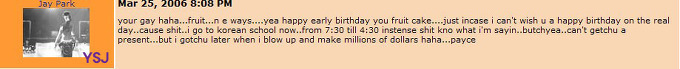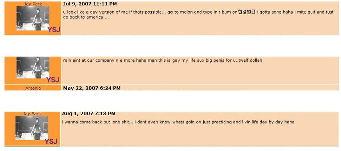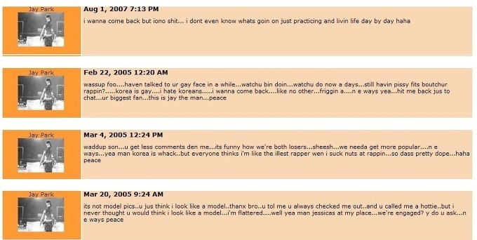 -잘지내냐 foo, 니 그지같은 면상에 얘기안한것도 꽤 됬네 .. 어떻게 사냐.. 요즘엔 뭐해 .. 아직도 니 그 랩에 멍청한 짓거리 하고있냐 ? .. 한국 그지같애 .. 열라 싫어 ... 딴거필요없고 돌아가고싶다 .. 존나 .. 아 ..어쨌든 담에 말걸어라.. ur biggest fan .. 난 멋진놈 jay .. peace