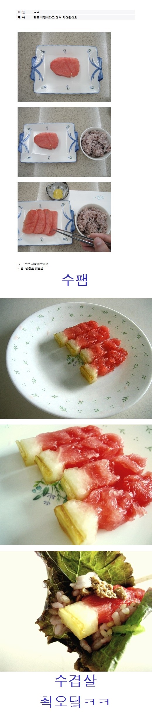 [스크랩] [유머](펌)수박 고급스럽게 먹기 작성자블랙록슈터|작성시간12.07.13|조회수7,221 목록 댓글 14 글자크기 작게가 글자크기 크게가 오늘의 유머 작성자 : 제2의이준영★ 다음검색 스크랩 원문 : 생존21C - 지진,재난,재앙,공황,전쟁,사고로부터의 생존스쿨 현재 게시글 추가 기능 열기 북마크 공유하기 신고 센터로 신고 댓글 댓글 14 댓글쓰기 답글쓰기 댓글 리스트 작성자이카페에서내아이디가제일길거같구나 | 작성시간 12.07.14 개뒤진다진짜 ㅋㅋㅋㅋㅋㅋㅋㅋㅋㅋㅋㅋㅋㅋㅋㅋㅋㅋ 작성자Posei Done | 작성시간 12.07.15 수니커즈 ㅋㅋㅋ 작성자그대를만나그의그녀가되었지 | 작성시간 12.07.16 케이크 ㅋㅋㅋㅋㅋㅋㅋㅋㅋㅋㅋㅋㅋㅋㅋ 작성자Loli | 작성시간 12.07.20 ㅋㅋㅋㅋㅋㅋㅋㅋㅋㅋㅋㅋ 작성자덮쳐보니장인 | 작성시간 12.07.22 ㅇ ㅏ ㅋ 진짜 디씨 ㅋ 댓글 전체보기