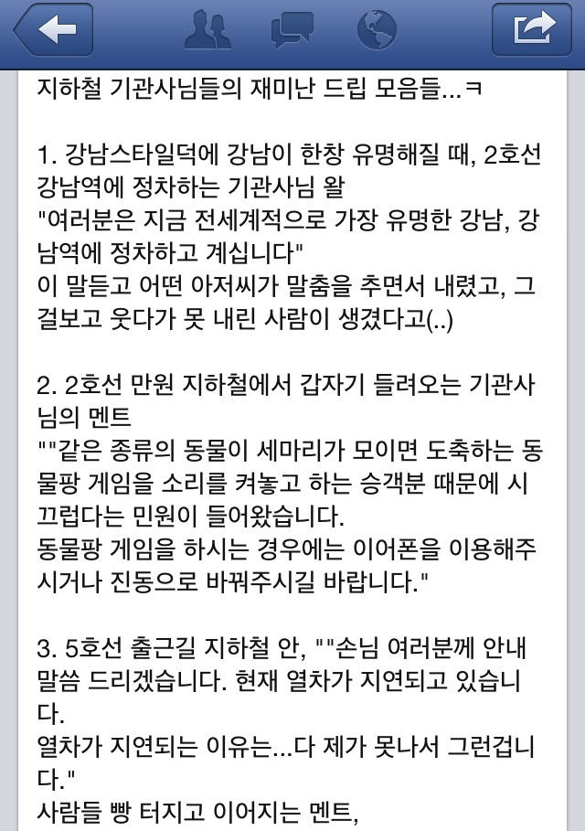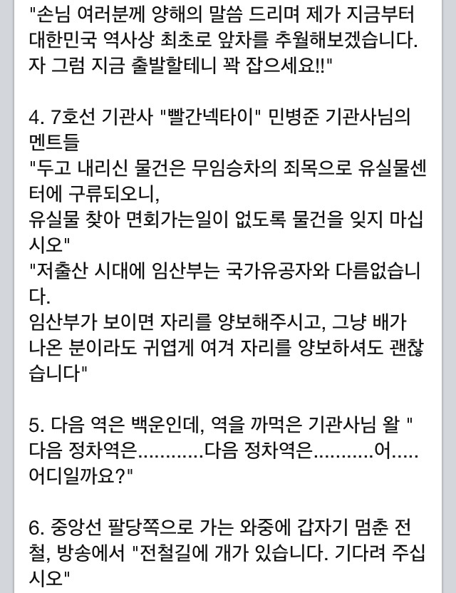 작성자아직은 동안~# 작성시간 12.12.16 1번은 우리승무소 후배얘기네요. 위에 멘트말고 특이한거 몇개 더했어요. 참고로 1,2,3,4호선은 2인승무로 방송을 차장이하고 나머지호선은 1인승무로 방송을 기관사가 합니다.