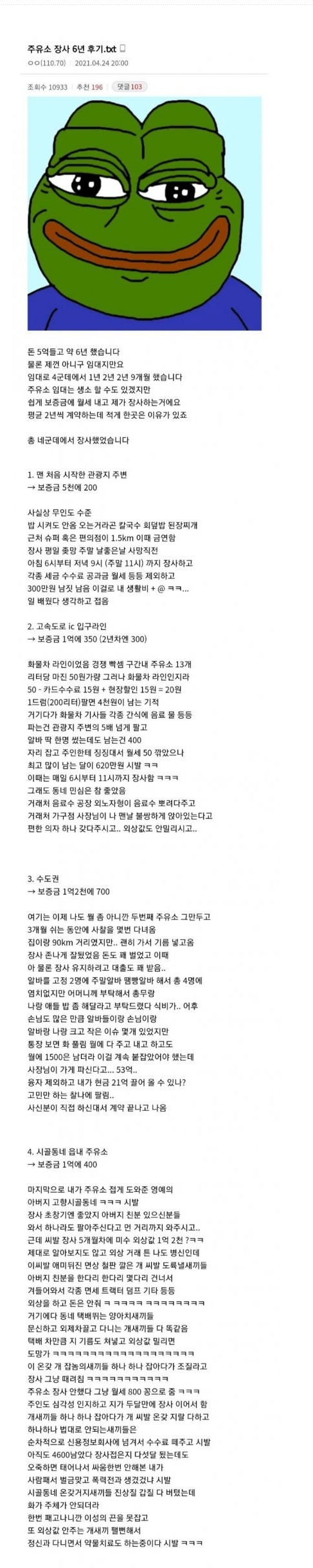 주유소 장사 후기 작성자너구리와함께춤을|작성시간21.05.26|조회수1,437 목록 댓글 5 글자크기 작게가 글자크기 크게가 ㅊㅊ 가생이 다음검색 현재 게시글 추가 기능 열기 북마크 공유하기 신고 센터로 신고 댓글 댓글 5 댓글쓰기 답글쓰기 댓글 리스트 작성자▷◁이제큐트 | 작성시간 21.05.26 원래 못사는 동네일수록 진상이 많음.. 작성자사과맛 | 작성시간 21.05.27 ㅋㅋㅋㅋㅋㅋㅋㅋㅋㅋㅋㅋ돈많은 새끼에 투정 작성자천국언덕 | 작성시간 21.05.27 아ㅡㅡ역시 외상은..ㅠ 작성자킬리만자로의냥이 | 작성시간 21.05.27 그래서 5억들고 시작했는데...얼마 남았죠? ㅠㅠ 우리 처남 생각나네...6억정도 들고 했는데...한푼도 안남았다는데....이건 도대체 뭐한건지요???? 작성자문 곡 | 작성시간 21.06.12 댓글 전체보기