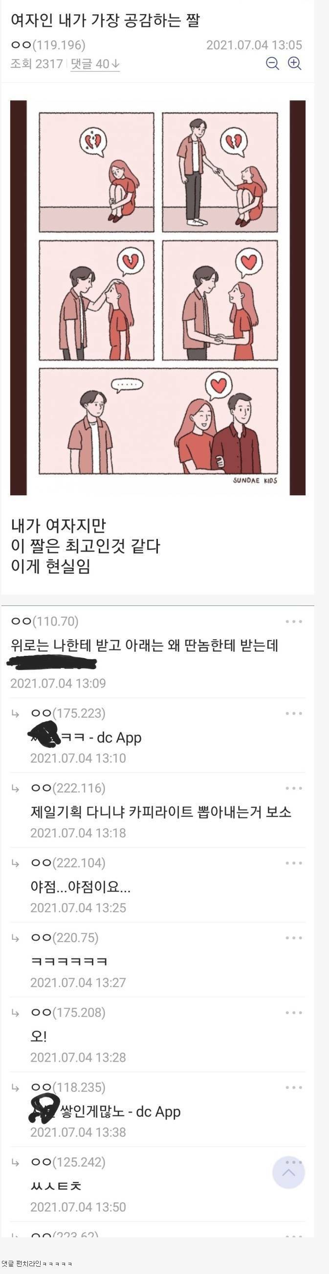 [스크랩] 여자인 내가 가장 공감하는 짤 작성자리빙티|작성시간21.07.09|조회수1,014 목록 댓글 4 글자크기 작게가 글자크기 크게가 다음검색 스크랩 원문 : 도탁스 (DOTAX) 현재 게시글 추가 기능 열기 북마크 공유하기 신고 센터로 신고 댓글 댓글 4 댓글쓰기 답글쓰기 댓글 리스트 작성자푸르메 | 작성시간 21.07.09 술 풀때는 날 찾고 술먹고 남친집가서 잠자고 술값은 내가 내고... 작성자초콜릿우체국 | 작성시간 21.07.09 -0- 컥 작성자천국언덕 | 작성시간 21.07.10 우와ㅡㅡ위로 아래로죽이네~^^ 작성자즐겨라 | 작성시간 21.07.10 다 그래 봤자야 감사합니다 댓글 전체보기
