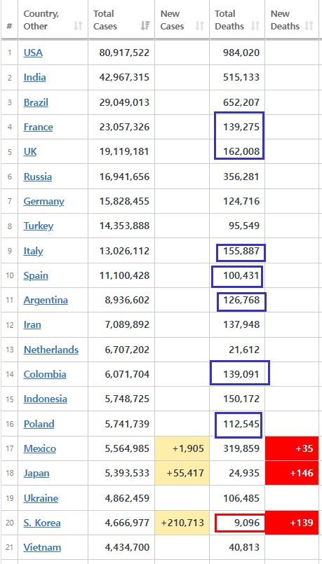 코로나 후반 오미크론증가세로인해 확진자수 20위까지 올라온 한국