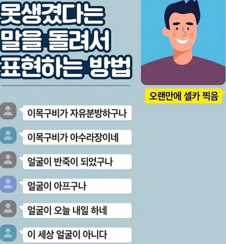 못생겼다는 말을 돌려서 표현하는 방법 작성자양은파러|작성시간23.03.10|조회수1,457 목록 댓글 7 글자크기 작게가 글자크기 크게가 유머는 유머일쁜~~^^ 다음검색 현재 게시글 추가 기능 열기 북마크 공유하기 신고 센터로 신고 댓글 댓글 7 댓글쓰기 답글쓰기 댓글 리스트 작성자멀꼬라바 | 작성시간 23.03.10 차라리 개성강하게 생겻다고 말해쥬라~ 작성자하늘공주 | 작성시간 23.03.10 그냥 못생겼다고 하는게 더 낳겠다 작성자ngm12 | 작성시간 23.03.11 상처받은 1人.ㅜㅜ 작성자黑玉 | 작성시간 23.03.12 진짜 못생기면 외모얘기 안함 작성자아진유진맘 | 작성시간 23.03.16 차라리 직설적으로 말해주삼.. 돌리지마 댓글 전체보기