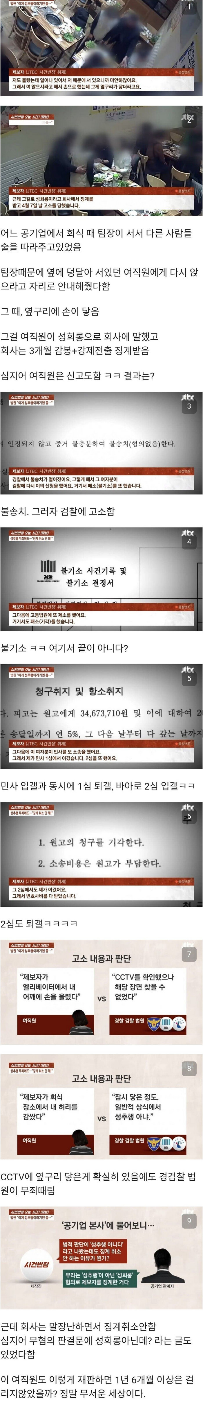 [스크랩] 옆구리 손닿았다고 성희롱 고소한 여직원 작성자파괴된사나이|작성시간26.04.08|조회수214 목록 댓글 3 글자크기 작게가 글자크기 크게가 다음검색 스크랩 원문 : 솔로문닷컴, 잃어버린 사랑을 위하여.. 현재 게시글 추가 기능 열기 북마크 공유하기 신고 센터로 신고 댓글 댓글 3 댓글쓰기 답글쓰기 댓글 리스트 작성자지겟골 | 작성시간 05:39 new 악감정이 있었나보네 작성자시우아빠 | 작성시간 08:44 new 공기업 사장 짜르고 재산몰수 해야 할듯 작성자초콜릿우체국 | 작성시간 11:41 new 그래서 항상 이성 조심. 아이 가르치는 경우가 있어 학부모님을 만나기도 하는데, 이성일 경우는 1m 이상 거리 두고 얘기함. 댓글 전체보기
