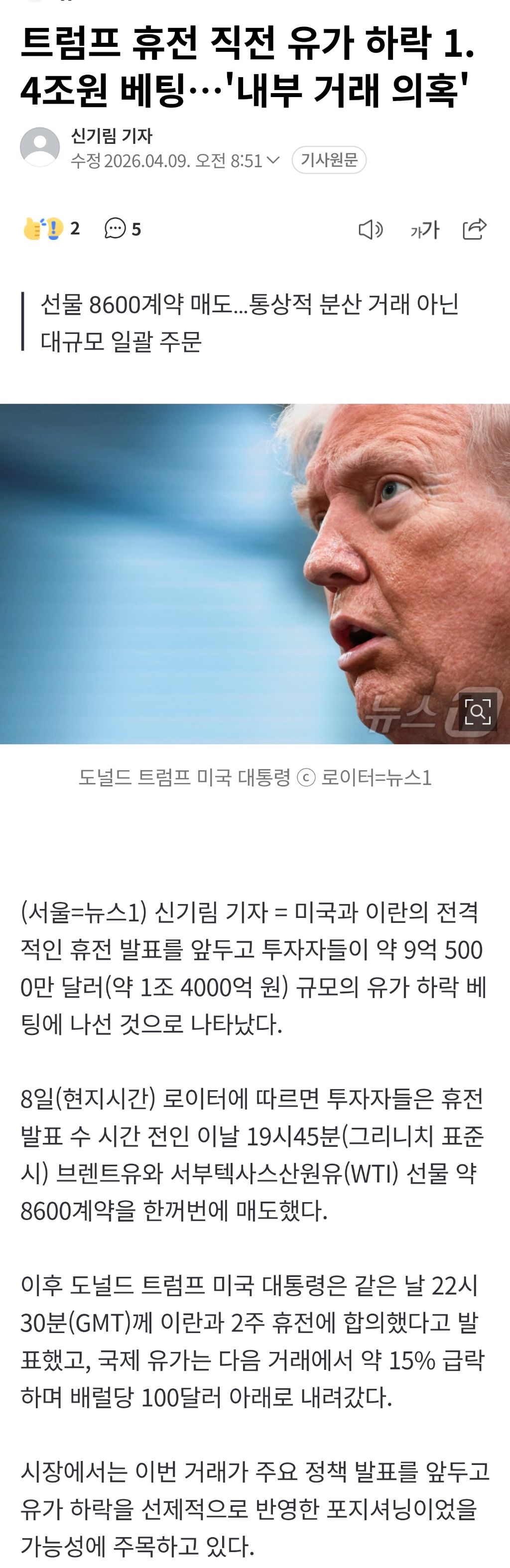 [스크랩] 트럼프 휴전 직전 유가 하락 1.4조원 베팅…'내부 거래 의혹' 작성자소소비2|작성시간11:32|조회수111 목록 댓글 0 글자크기 작게가 글자크기 크게가 https://n.news.naver.com/mnews/article/421/0008878879트럼프 휴전 직전 유가 하락 1.4조원 베팅…'내부 거래 의혹'미국과 이란의 전격적인 휴전 발표를 앞두고 투자자들이 약 9억 5000만 달러(약 1조 4000억 원) 규모의 유가 하락 베팅에 나선 것으로 나타났다. 8일(현지시간) 로이터에 따르면 투자자들은 휴전 발n.news.naver.com 다음검색 스크랩 원문 : 樂soccer 현재 게시글 추가 기능 열기 북마크 공유하기 신고 센터로 신고 댓글 댓글 0 댓글쓰기 답글쓰기 댓글 리스트