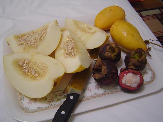 노란 것은 망고, 붉은 껍질에 하얀 속살인 건 망고스틴, 쪼개져 있는 건... 까먹었군요. 하미과였던가...(...)